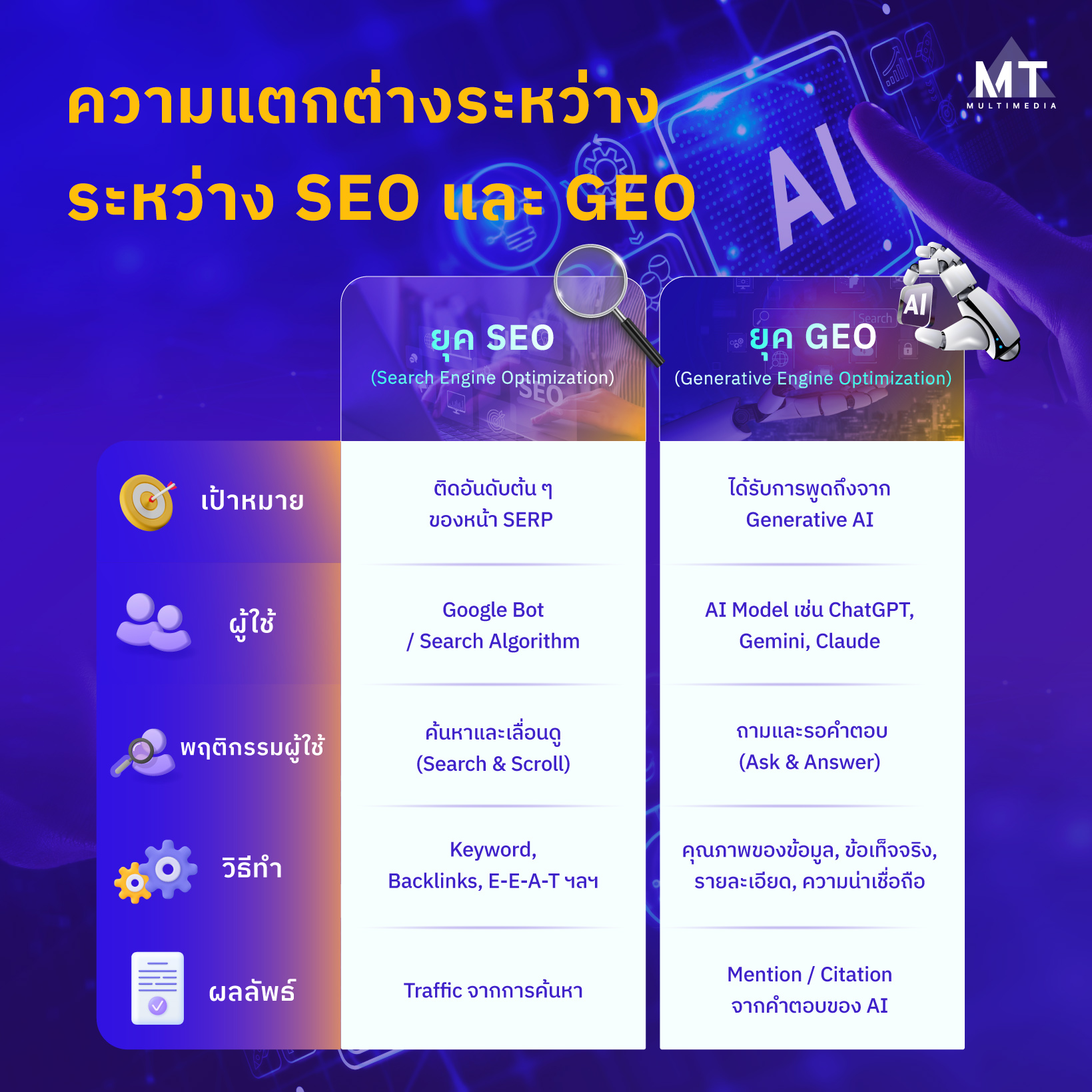 การทำ SEO เพื่อให้เว็บติดอันดับต้น ๆ จึงไม่ใช่คำตอบที่ถูกต้องที่สุดอีกต่อไป ทำให้จุดประสงค์ในการสร้างคอนเทนต์และเว็บไซต์ต้องตอบโจทย์ทั้ง “คน” และ “AI” แทน เทรนด์ใหม่อย่าง GEO จึงกำเนิดขึ้น