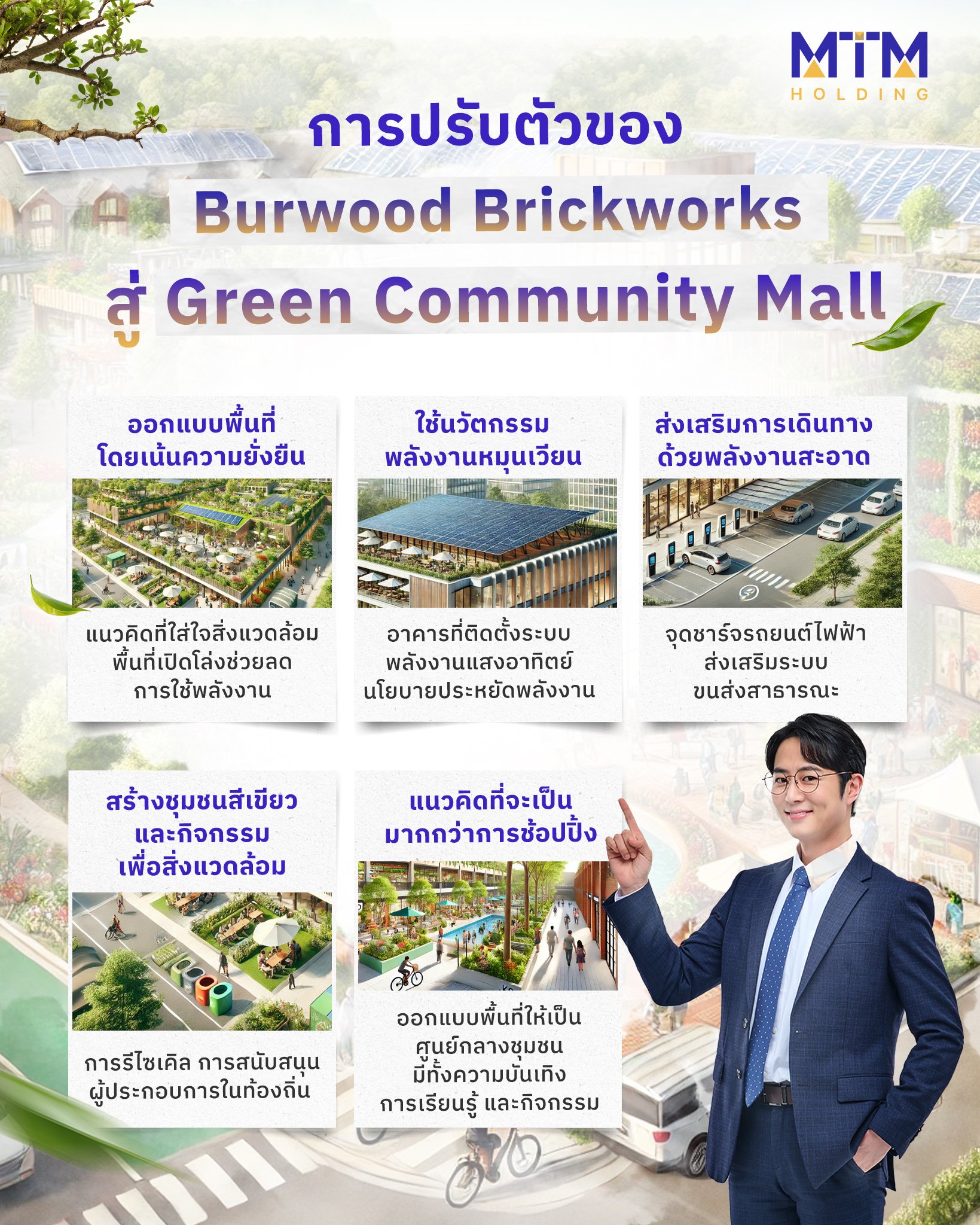 อย่างไรก็ตาม การนำแนวทางปฏิบัติที่ยั่งยืนมาใช้ภายใน Community Mall ไม่เพียงขับเคลื่อนเป้าหมายด้านความยั่งยืนเท่านั้น แต่ยังสามารถสร้างการมีส่วนร่วมกับคู่ค้า ลูกค้า และประชาชนในละแวกพื้นที่โครงการ Community Mall ได้ด้วย ยกตัวอย่าง แนวทางปฏิบัติทางด้านความยั่งยืนของศูนย์การค้าต่างประเทศ “Burwood Brickworks” ซึ่งได้รับการรับรองจาก Living Building Challenge® ว่าเป็นศูนย์การค้าที่ยั่งยืนที่สุดในโลก และเป็นศูนย์การค้าแห่งแรกที่ได้รับการรับรองนี้ เป็นสิ่งยืนยันว่าโครงการฯ มีการออกแบบและก่อสร้างด้วยแนวคิดที่ยั่งยืนและเป็นมิตรกับสิ่งแวดล้อม